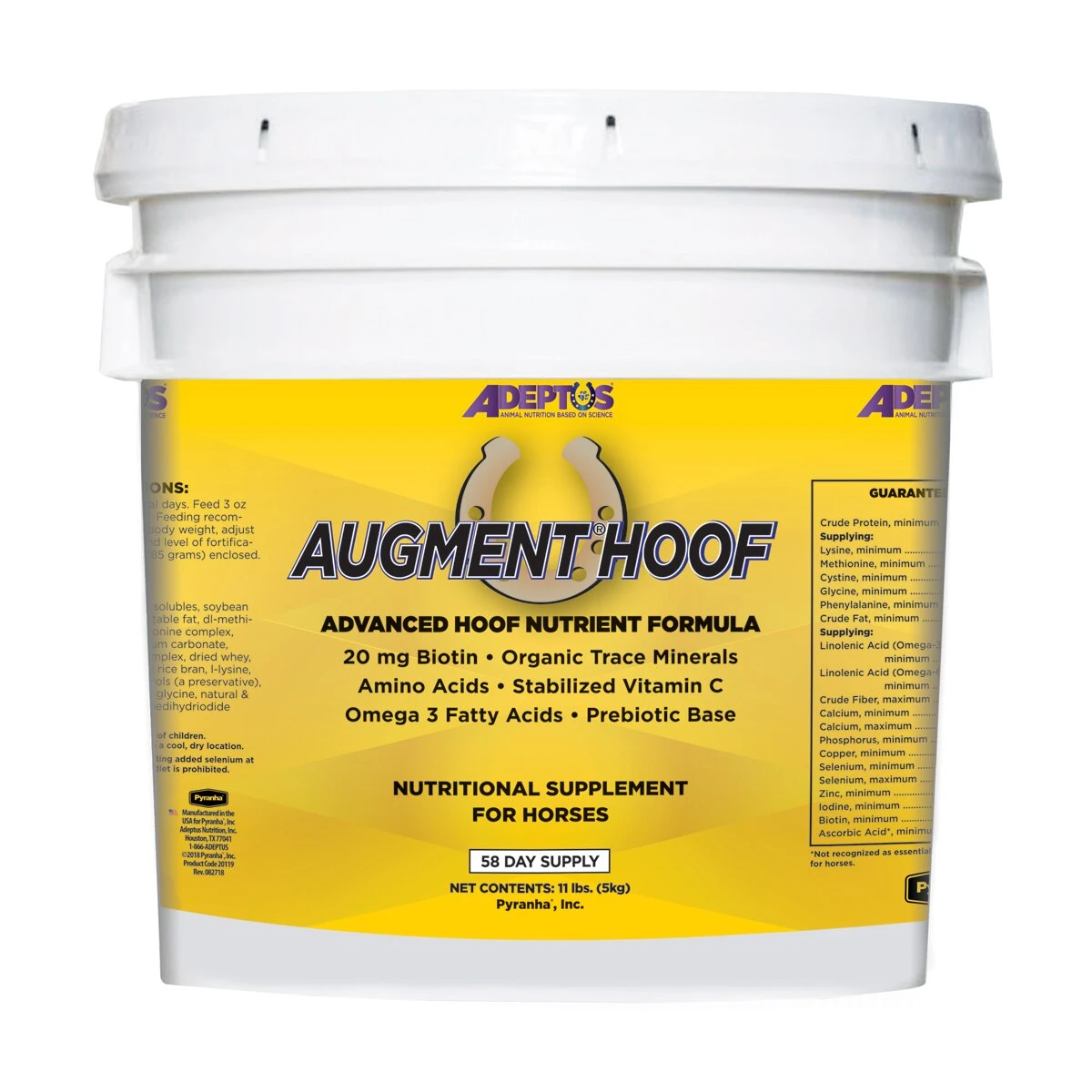 Augment Hoof® is a very advanced product that contains synergistic nutrients for strong, healthy hoof structures. The key ingredients it provides include 20 mg of biotin and bioavailable organic trace minerals and vitamins. Because omega fatty acids are also beneficial to hoof health, this formula includes omega 3 and omega 6 fatty acids. A prebiotic base of yeast culture rounds out the formula. This product contains no alfalfa meal or added sugar.