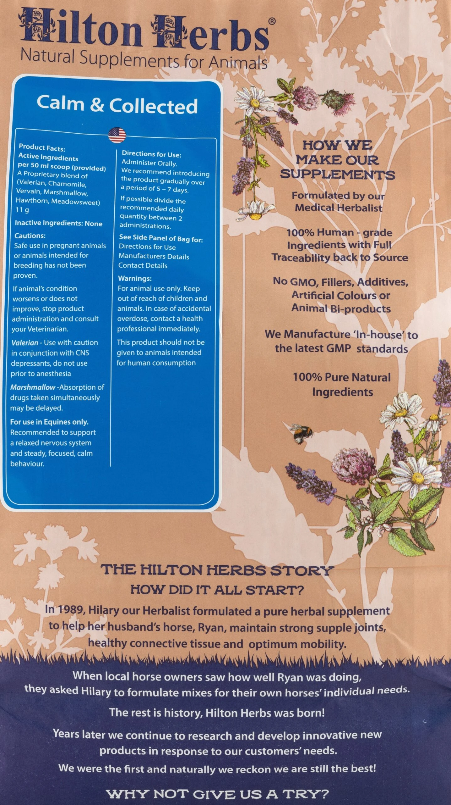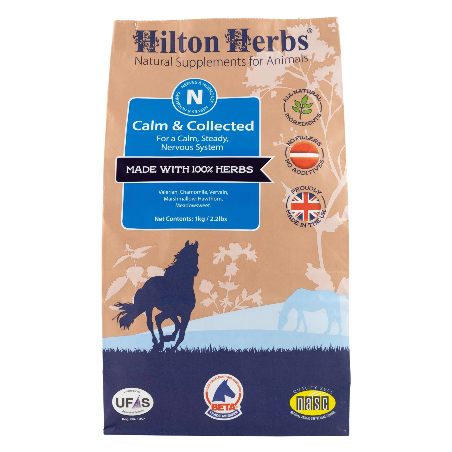Calm & Collected by Hilton Herbs is a natural calming supplement for horses and ponies. This supplement contains a pure dried herbal blend of valerian, vervain, chamomile, hawthorn, marshmallow, and meadowsweet.Β Calm & CollectedΒ is designed for the nutritional maintenance and support of a healthy nervous system.