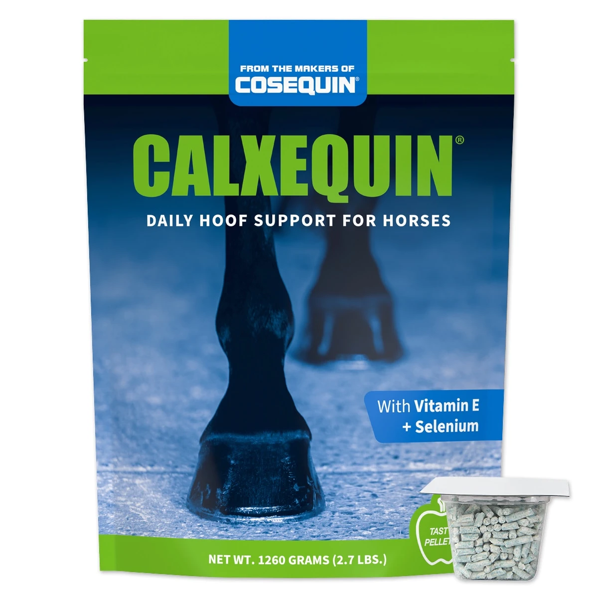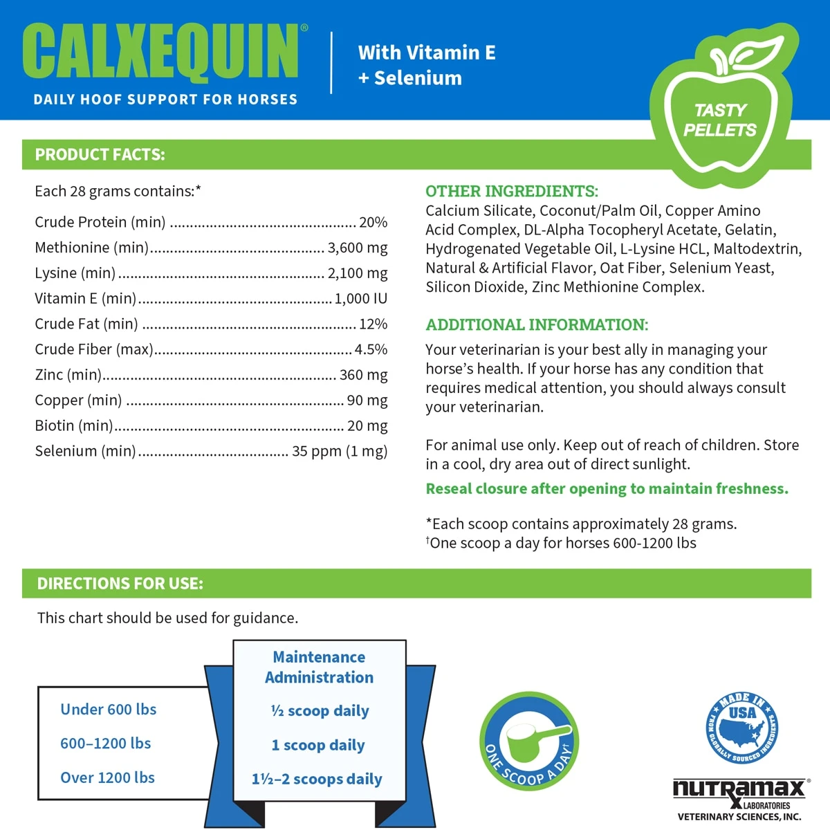From the #1 vet recommended joint health supplement brand, Nutramax®, now offers hoof support. Formulated to promote health in your horse from the ground up, Calxequin® provides the necessary nutrients that your horses might be missing from their daily diet. These tasty pellets deliver ingredients such as 20 mg of biotin, key minerals for healthy hoof growth, and amino acids such as methionine and lysine to support hoof integrity. In addition, includes is 1000 IU of Vitamin E and 1 mg of Selenium, important antioxidants that work together to support a healthy immune system and help neutralize free radicals, the damaging by-products of normal cellular activity. The nutrients in Calxequin are safe and readily absorbed in balanced proportions to support the progress of growing stronger, more durable hooves.