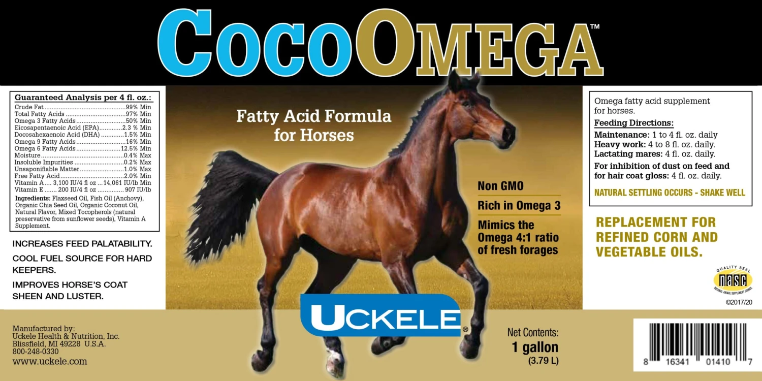 CocoOmega provides concentrated ingredients for hair, skin, hoof, joint, and immune health. A blend of omega-3 rich flax seeds, chia seeds, and fish oil create a 4:1 ratio of omega-3 to omega-6 fatty acids, mirroring the ratio found in grass to promote a shiny, healthy coat and a normal response to inflammation. CocoOmega additionally supplies the important fatty acids alpha-linolenic, EPA, and DHA to support brain and nervous system function. Aiding in the absorption of the fat-soluble vitamins A, D, E and K and many naturally occurring plant phytonutrients, the formula can also be used to support mares, foals, and growing horses during gestation, lactation, and maturation. Best of all, its highly palatable flavor helps encourage picky eaters.
