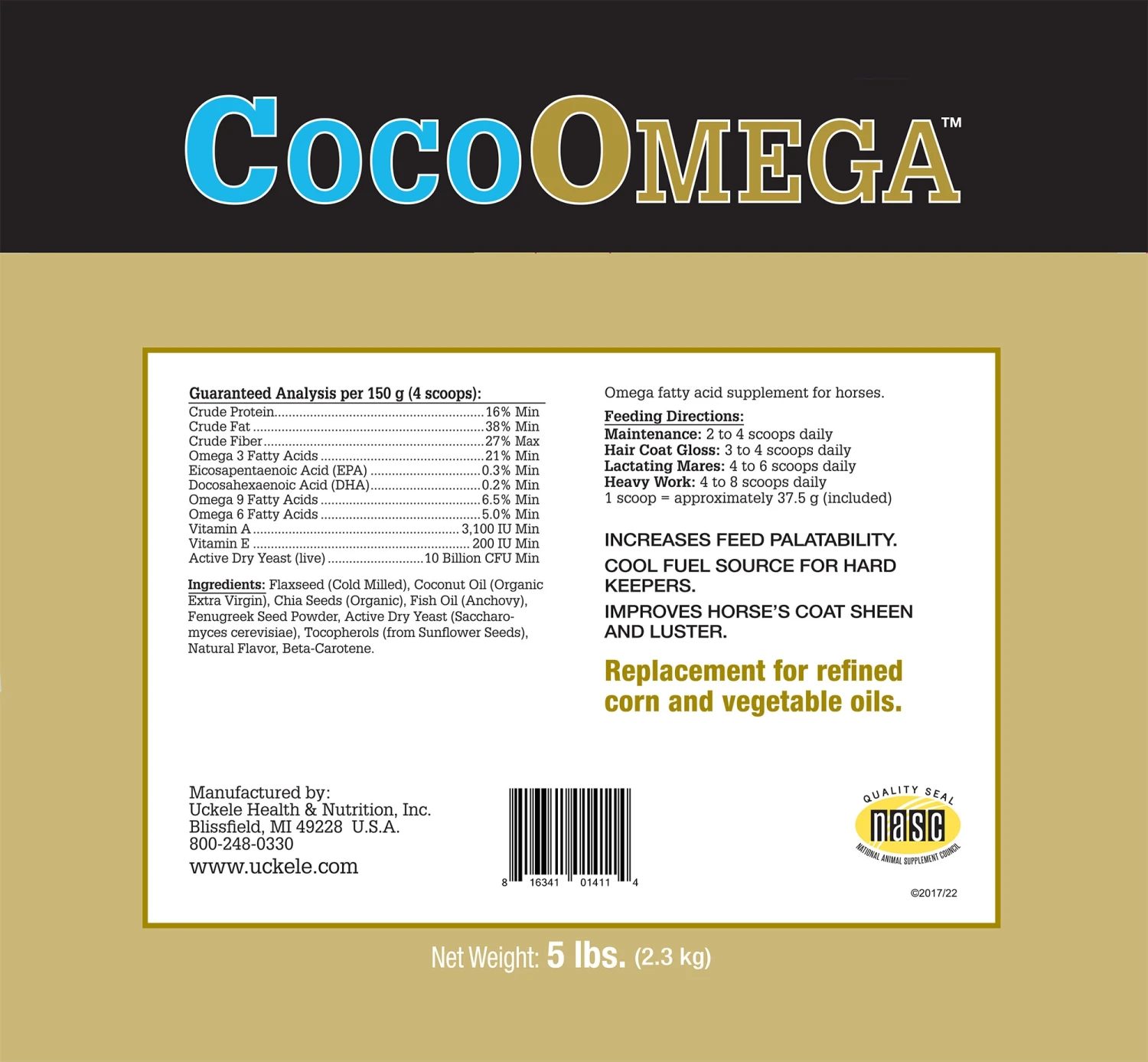 CocoOmega™ provides concentrated ingredients for hair, skin, hoof, joint, and immune health in mess-free granules. A blend of omega-3 rich flax seeds, chia seeds, and fish oil create a 4:1 ratio of omega-3 to omega-6 fatty acids, mirroring the ratio found in grass to promote a shiny, healthy coat and a normal response to inflammation. CocoOmega additionally supplies the important fatty acids alpha-linolenic, EPA, and DHA to support brain and nervous system function. Aiding in the absorption of the fat-soluble vitamins A, D, E and K and many naturally occurring plant phytonutrients, the formula can also be used to support mares, foals, and growing horses during gestation, lactation, and maturation. Best of all, its highly palatable flavor helps encourage picky eaters.