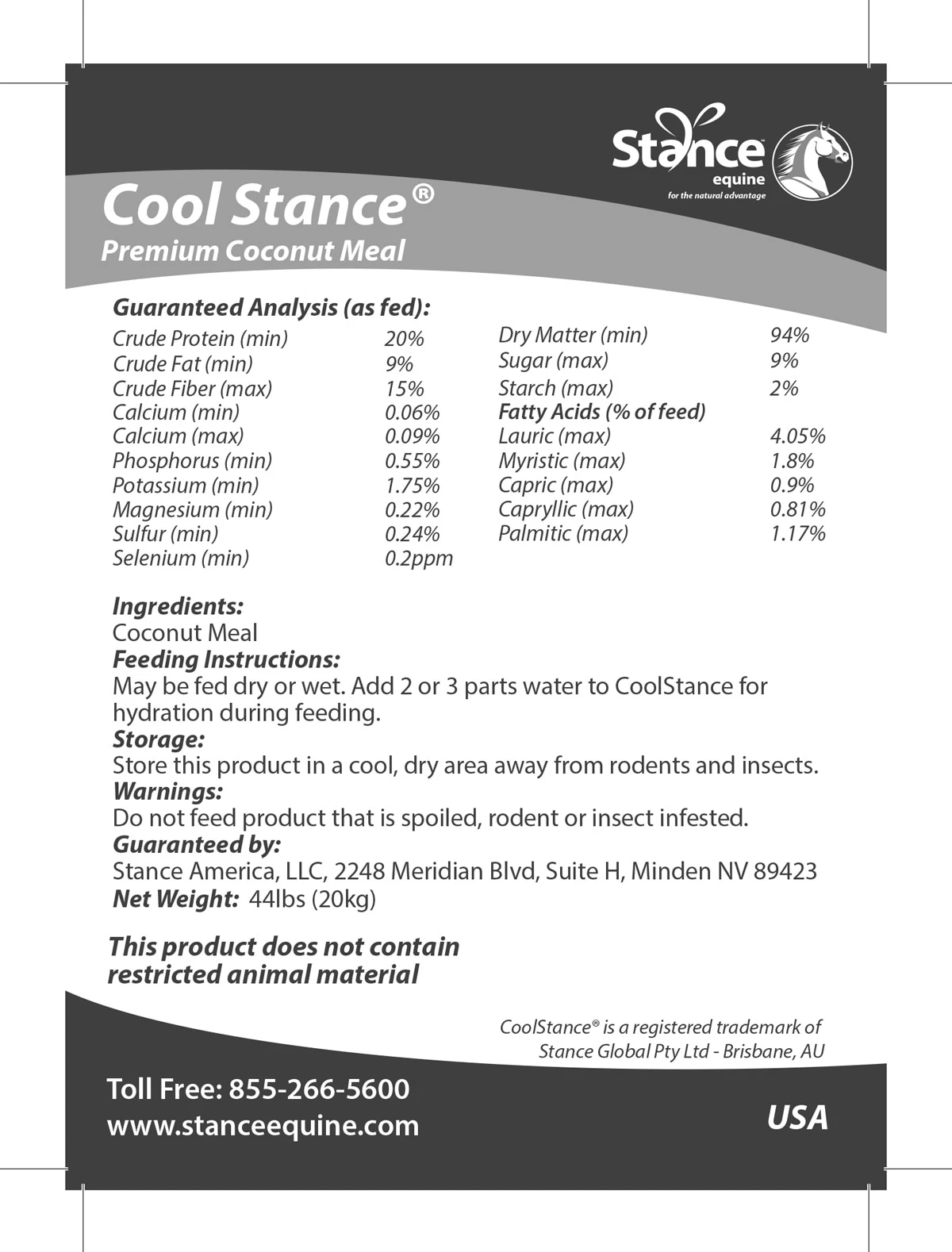 CoolStance® is a premium quality coconut meal that is dried, baked, and ground to provide a “cool” source of calories for horses. This “cool” source of energy comes from quality protein and Medium Chain Triglycerides (MCT) found in the coconut meal. These fatty acids are readily digestible and also support skin and coat health. Additionally, this highly palatable supplement can be fed dry or as a mash. Finally, CoolStance® is low on the glycemic index as it contains less than 11% Non-Structural Carbohydrates (NSC), making it a great choice for horses that need additional calories but need to be on low sugar diets or tend to exhibit excitable behavior. Please note: days supply will vary depending on the amount being fed.