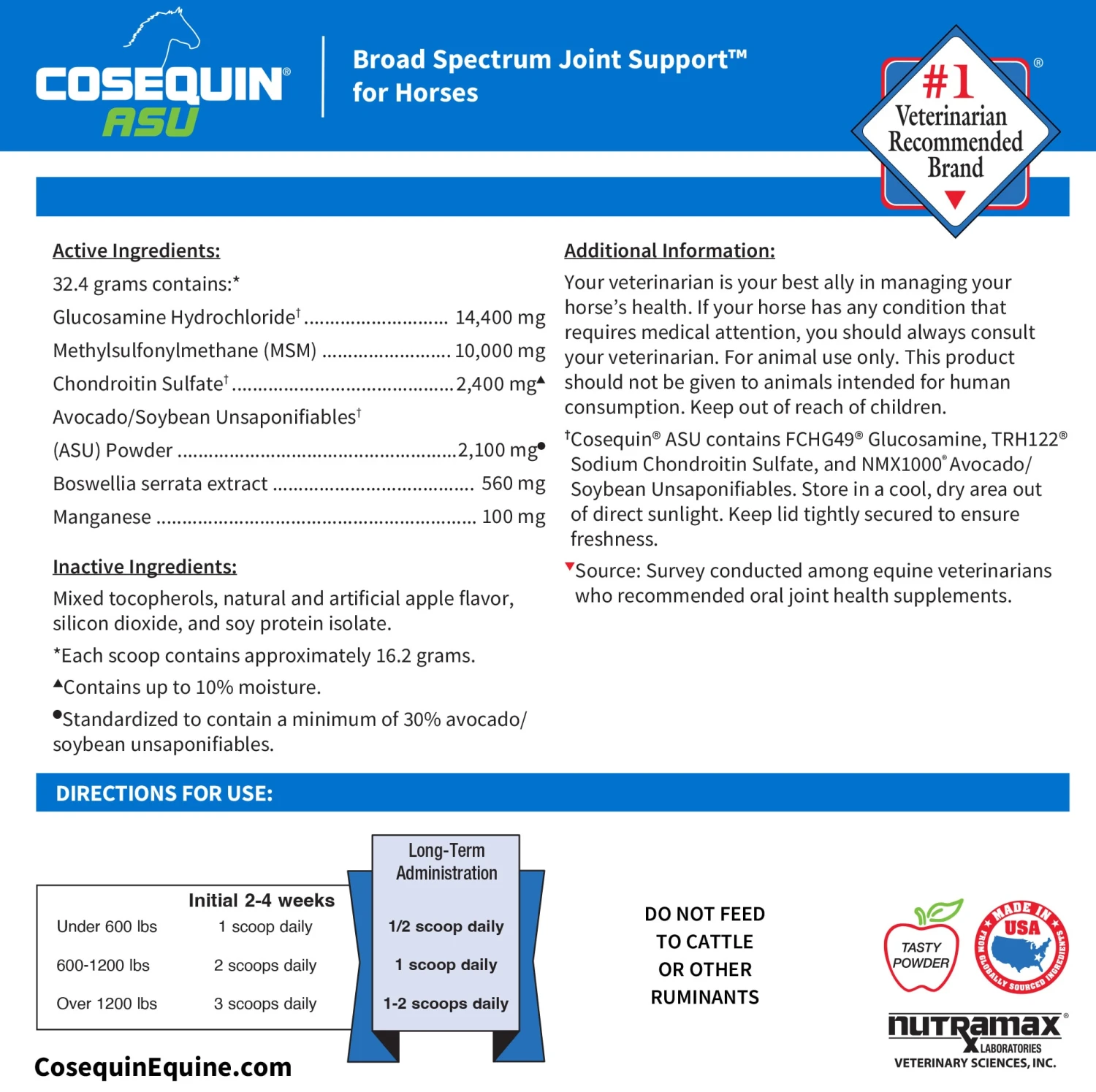 - Formulated for Your Horse: ASU complements the positive effects of the glucosamine and chondroitin sulfate in Cosequin ASU, providing broad spectrum joint support for the equine athlete.