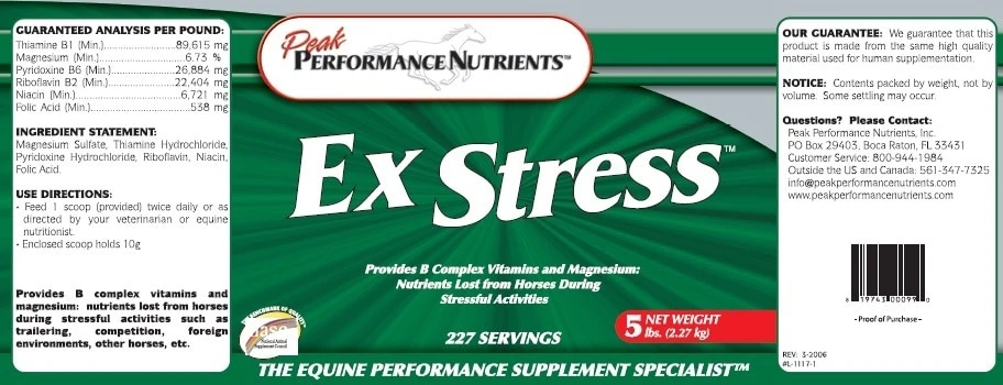 Ex Stress is an all-natural, herb-free formula to help your horse handle the stress of travel and competition. Ex Stress contains concentrated levels of vitamin B1 (thiamine), other B vitamins, and magnesium.
