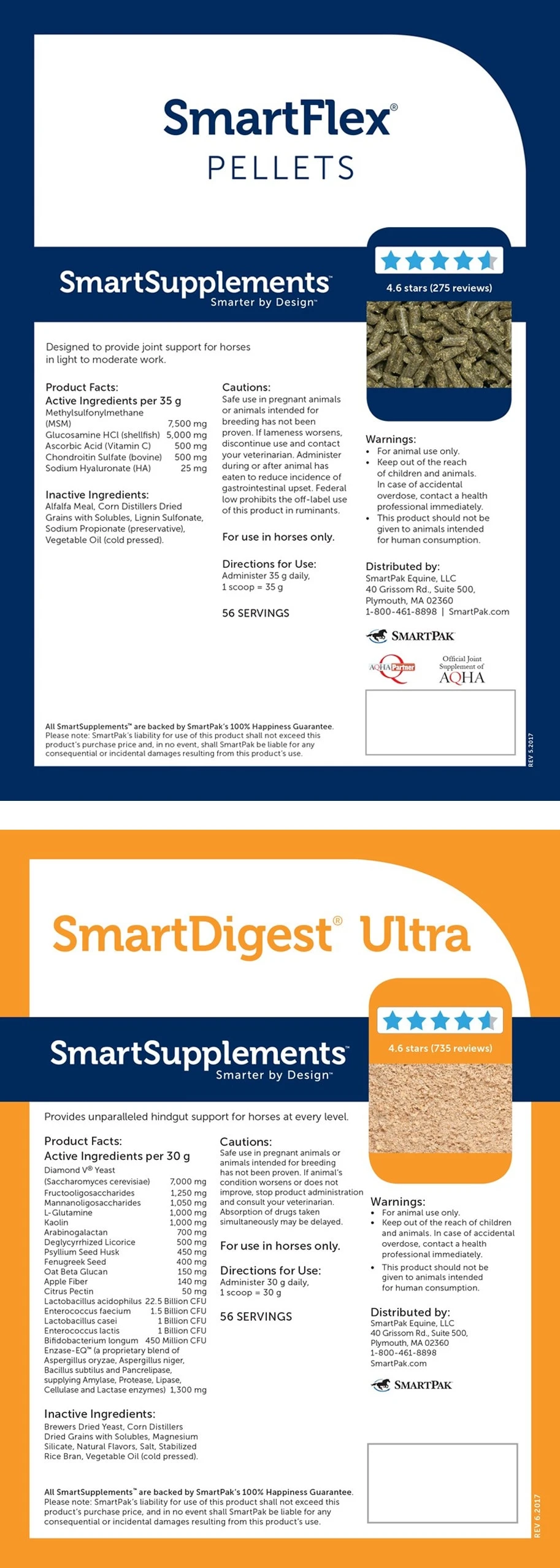 “We designed the Foundation SmartPak to target two of the most important areas for your horse’s overall health and performance: joint and digestive. With targeted ingredients to help maintain comfortable movement and digestive support backed by up to $15,000 in colic surgery reimbursement, you can rest easy knowing that your horse has support to help him feel his best.” – The SmartPak Horse Health Experts