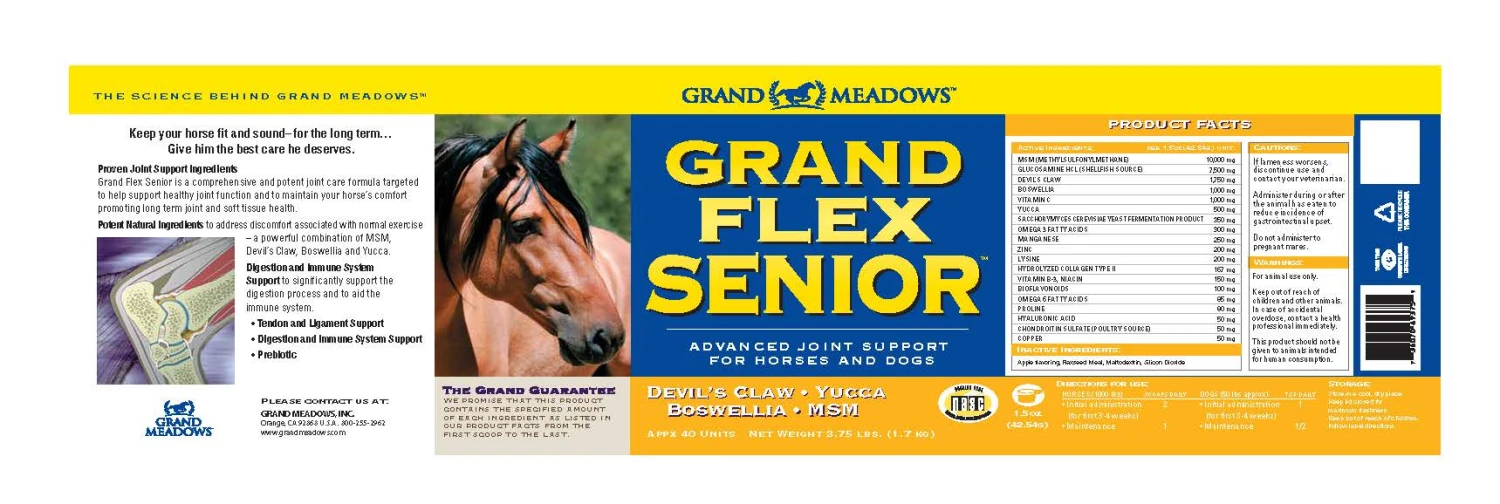 Grand Flex Senior is a targeted senior joint supplement from the makers of Grand Flex! Formulated to help support overall joint health and to help manage stiffness and soreness in senior horses, Grand Flex Senior provides a synergistic blend of 7,500 mg of glucosamine, 50 mg of depolymerized chondroitin sulfate, 50 mg of HA, 10,000 mg of MSM, and type 11 collagen. A powerful mix of devil’s claw, yucca, boswellia, omega 3 & 6 fatty acids combine to provide support for soreness and stiffness and Diamond V Yeast is included to support the digestive system. Grand Flex Senior also contains the correct blend of vitamins, amino acids, and minerals that are essential to make the joint support ingredients perform at their optimum level.