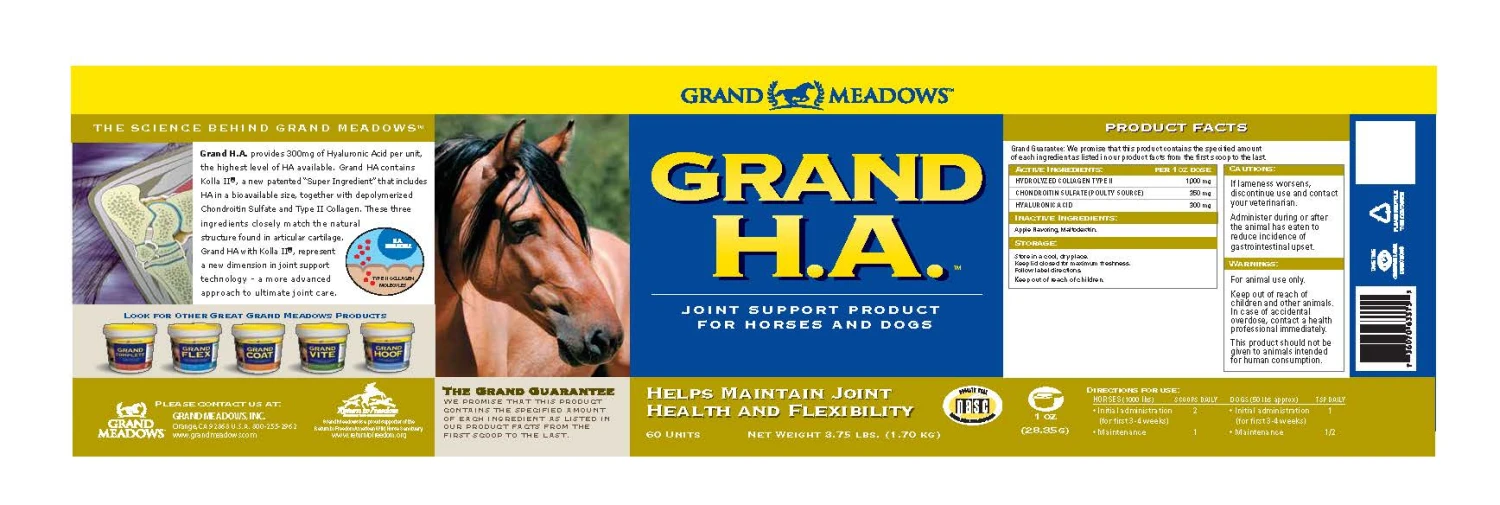 Grand HA represents the first hyaluronic acid product for horses that provides a dosage level of 300 mg HA per serving. Grand HA contains Biocell Collagen II, a triple-patented ingredient that, through a complex hydrolyzing process, causes the molecular size of the HA and the chondroitin sulfate to be reduced in size to 1/90th of their original sizes, presumably making it more easily absorbed into the bloodstream. The other revolutionary aspect to Biocell Collagen II is the way the ingredients closely replicate the actual form of cartilage in the joint. By providing a combination of Collagen II, the main structure of cartilage, depolymerized chondroitin sulfate, and HA, it matches the key structures that support healthy joint function.