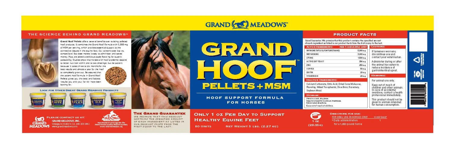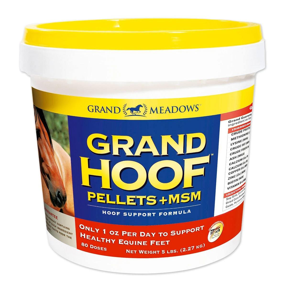 Tired of losing shoes? Dry, broken, crumbly, or cracked hooves? Try Grand Hoof. A concentrated 1 oz serving of Grand Hoof contains a blend of 5,000 mg of MSM, biotin, methionine, lysine, zinc, copper, B6, and probiotics. Delicious apple flavoring!