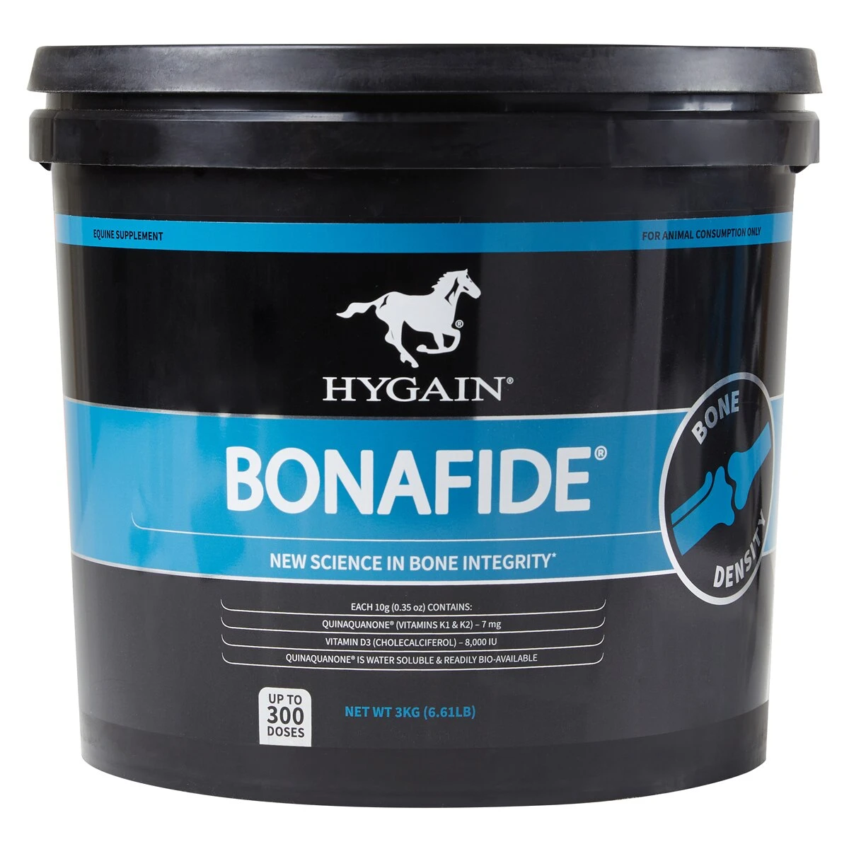 Vitamins K1 and K2 are naturally available in fresh pasture, but are unstable, and are at risk for degradation by UV light or wilting. It has been shown that horses who are removed from Vitamin K-rich pastures have a reduction in bone density within 7-10 days. Vitamins K1 and K2 play a critical role in the function of osteocalcin, known to bind minerals and protein in the bone together. Without enough Vitamin K1 and K2, the binding process is not complete and may result in poor bone and cartilage quality. Bonafide® features Quinaquanone, a patented and bioavailable form of Vitamins K1 and K2.