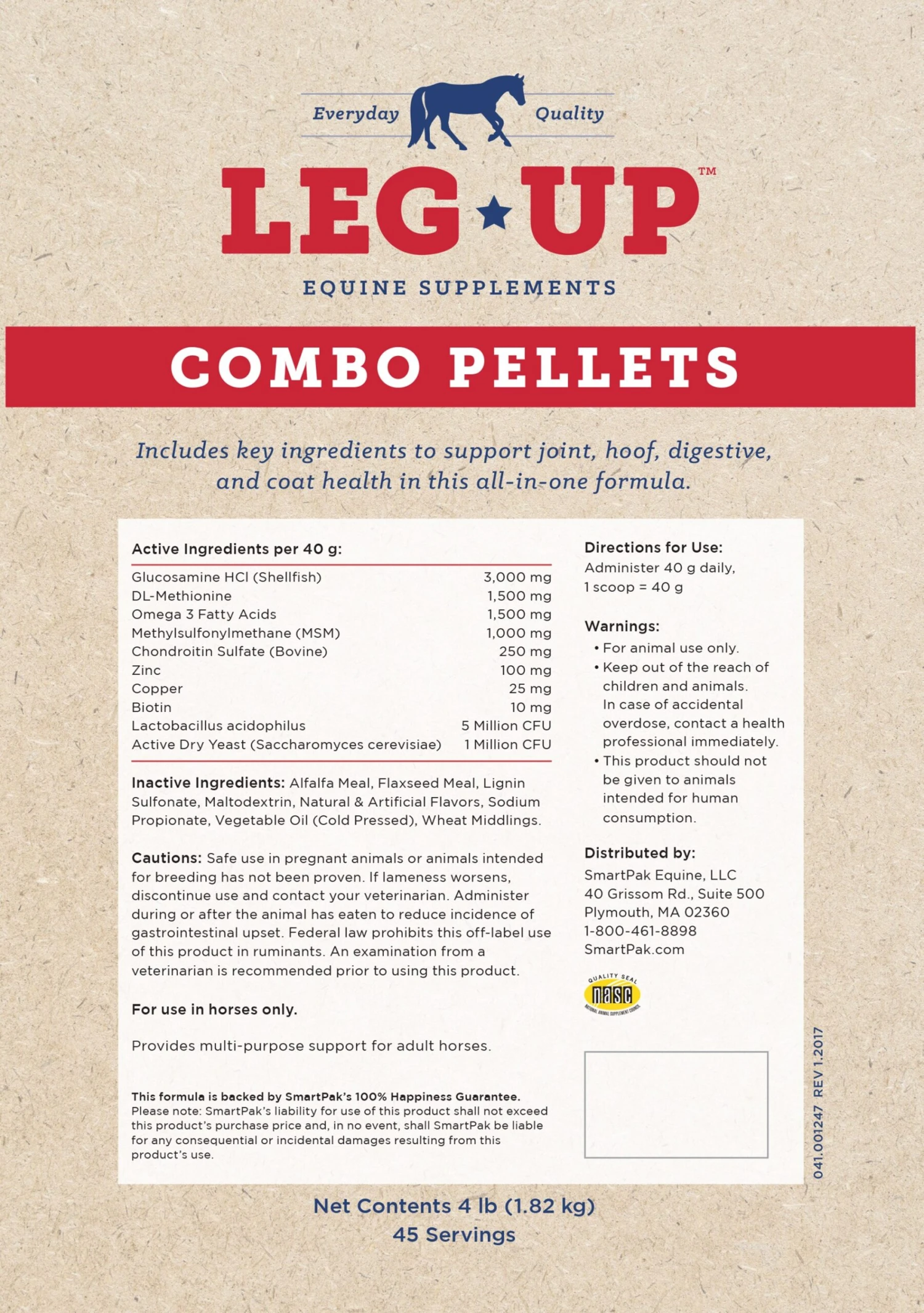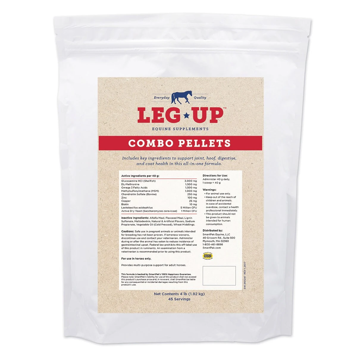 Leg Up® Combo Pellets provide four key areas of support in easy-to-feed pellets. This formula includes glucosamine, chondroitin sulfate, and MSM for joint health, along with biotin and minerals for strong hooves. Leg Up Combo Pellets also include probiotics and yeast for digestive health, plus omega 3 fatty acids for a shiny coat. Leg Up Combo Pellets offer well-rounded, basic support for all horses, especially those in light work.