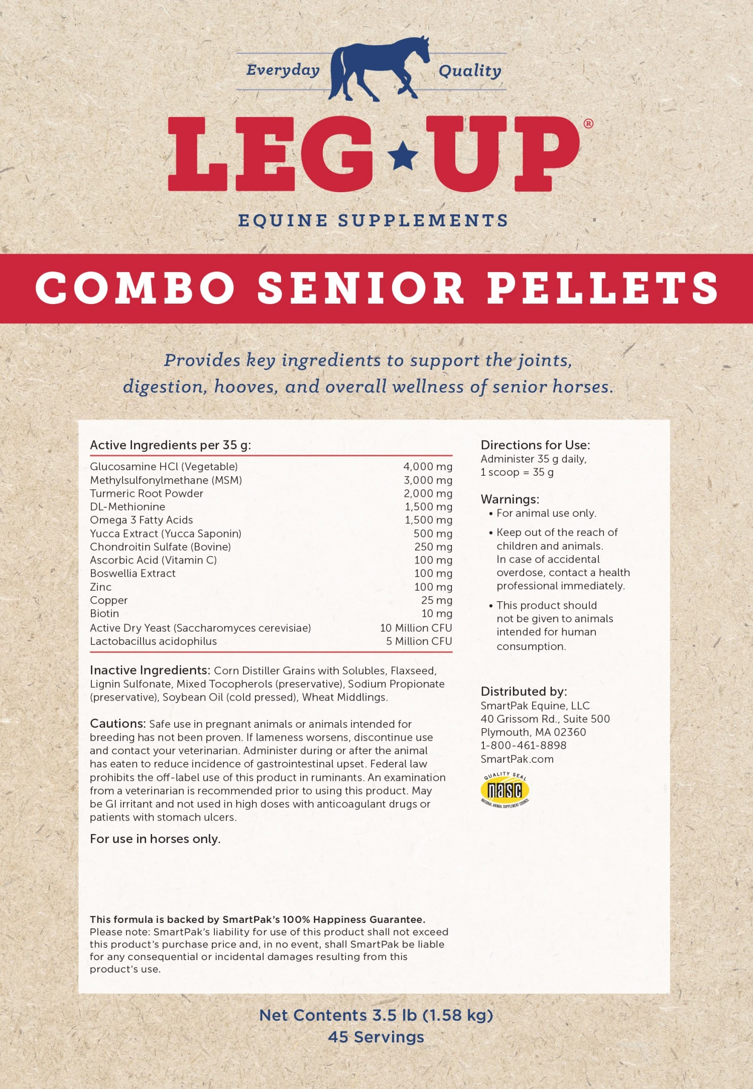 Leg Up® Combo Senior Pellets provide joint, hoof, digestive, skin, coat, and overall wellness support for older horses in tasty, convenient pellets that your horse will love. This formula includes glucosamine, chondroitin sulfate, MSM, yucca, boswellia, vitamin C, and 2,000 mg of turmeric to support healthy joints and help address discomfort associated with normal exercise and aging. Key ingredients such as biotin, methionine, zinc, and copper help keep your senior’s hooves strong and healthy. Plus, probiotics and yeast offer hindgut support for a normal digestive system. Finally, omega 3s from flaxseed support skin and coat health as well as overall wellness. This well-rounded supplement is an unbeatable value and is a great choice for active seniors as well as retired horses.