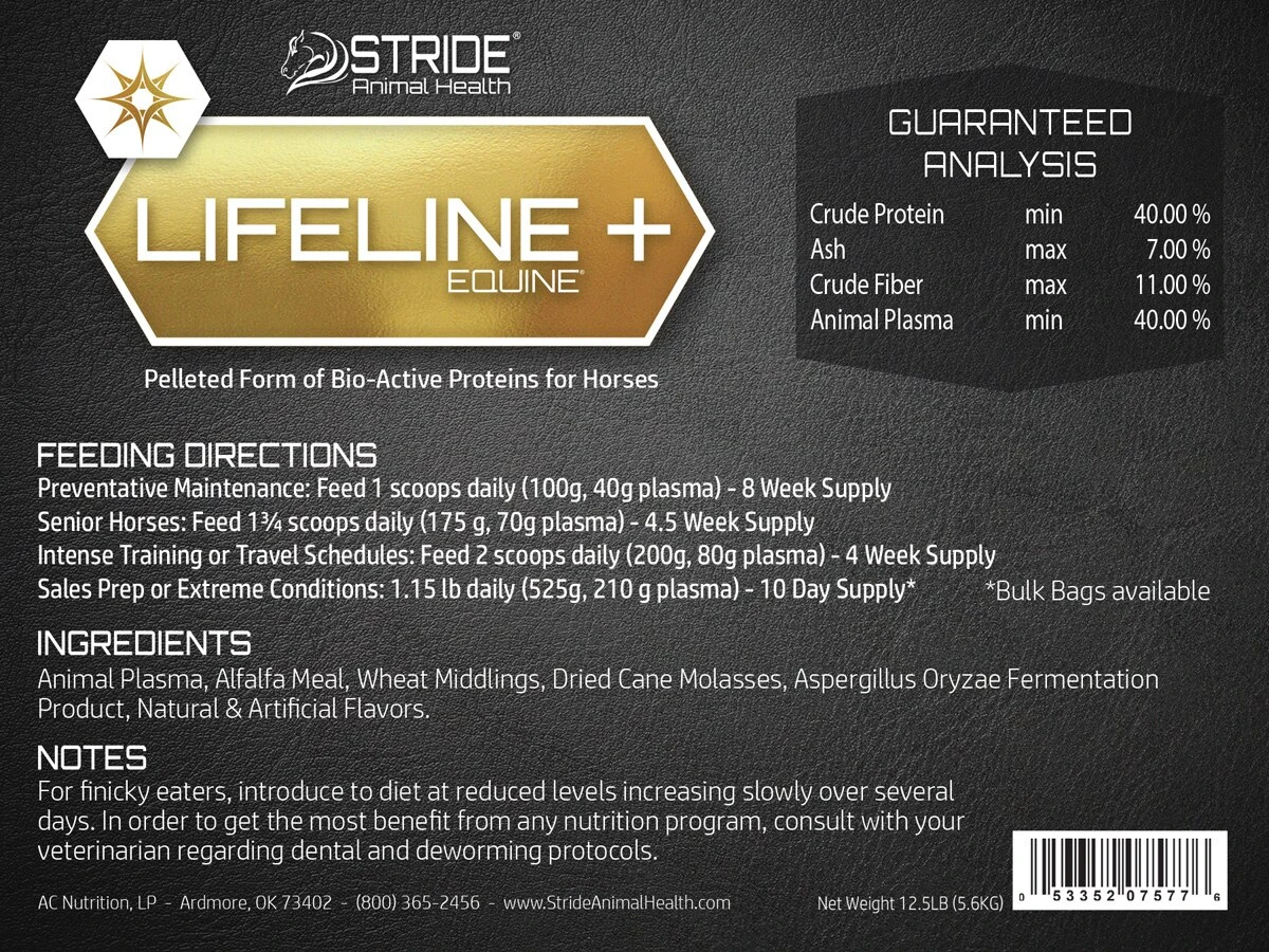 Lifeline+ Equine® delivers serum-derived biologically active proteins, plus a unique fermentable fiber, to horses in a convenient pellet form. The bioactive proteins work together to support the gut, lungs, joints, and immune system of horses under stress of training and performance.