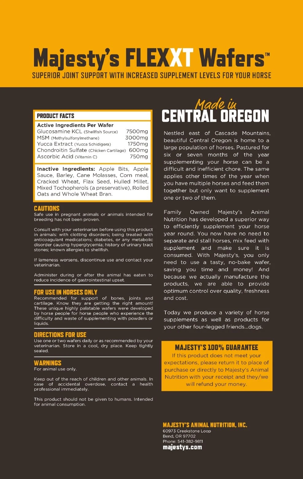 Majestyโs Flex XT Wafers offer the same joint health ingredients as the original Majestyโs Flex Wafers in higher levels for horses that need more support. It contains three times more glucosamine than the original formula, as well as increased levels of MSM, yucca, and vitamin C for well-rounded support. These tasty, easy-to-use wafers are a great way to help ensure that your horse is always getting the right amount of joint support every time.