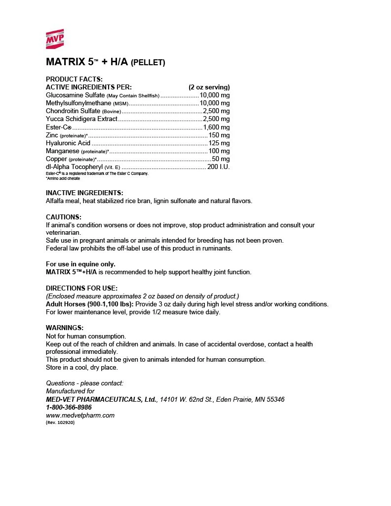 Matrix 5 HA is a high-level horse joint supplement in a pellet form! It contains 10,000 mg of glucosamine sulfate, 2,500 mg of chondroitin sulfate, 125 mg of hyaluronic acid, 10,000 mg of MSM, 2,500 mg of yucca, and 1,600 mg of Ester-C®.