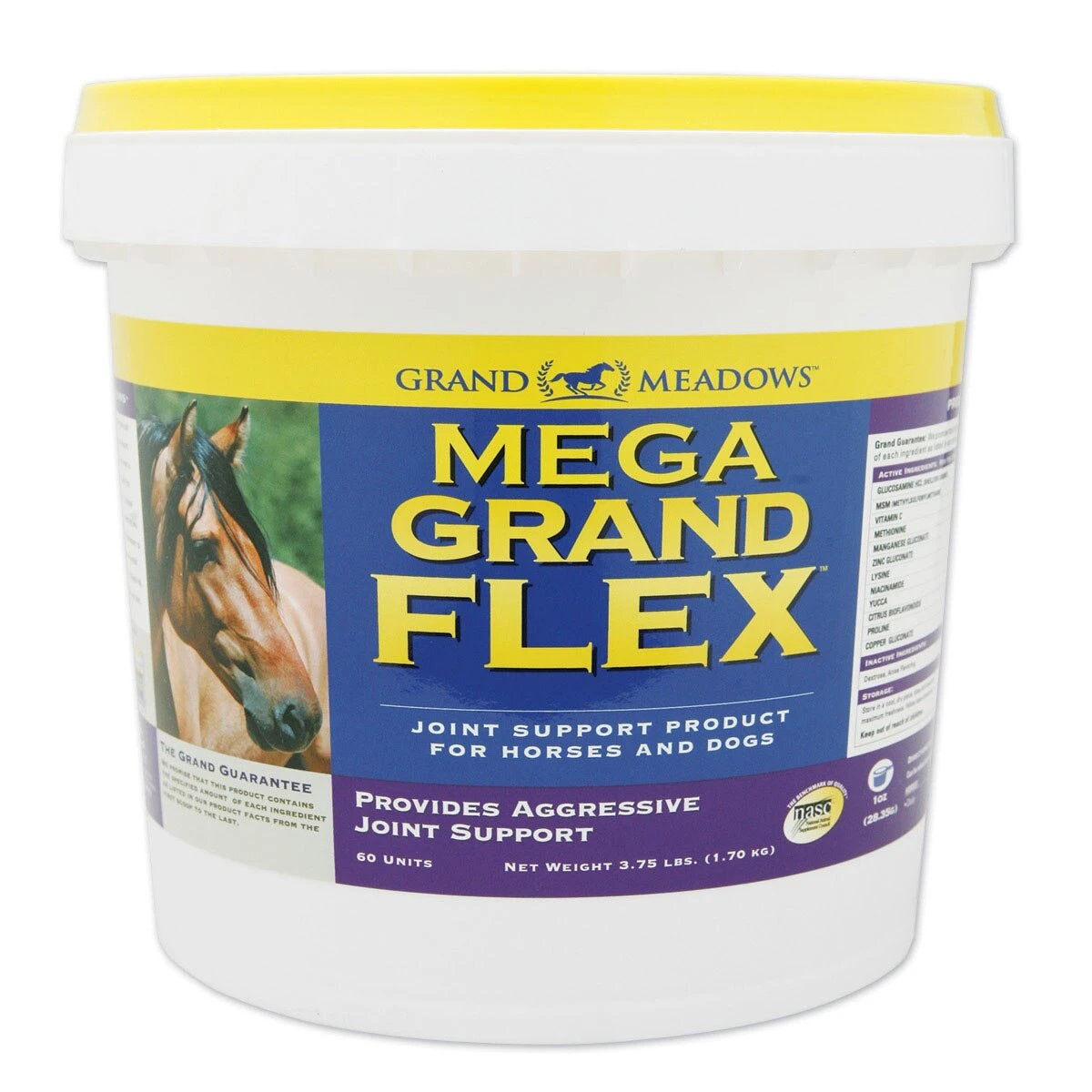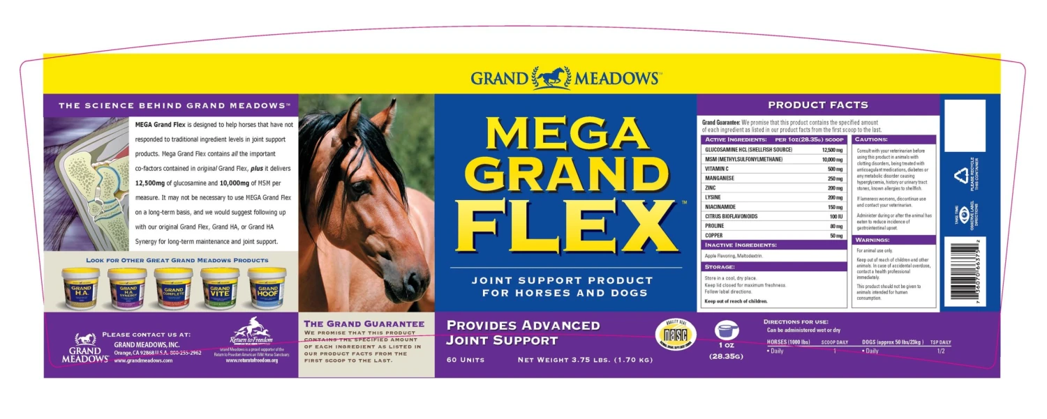 Mega Grand Flex is designed to help horses that have not responded to traditional ingredient levels in joint support products. Grand Meadows recommends that you use Mega Grand Flex when a more aggressive approach is needed. Mega Grand Flex contains all the important co-factors in original Grand Flex, plus 12,500 mg of glucosamine and 10,000 mg of MSM per serving.