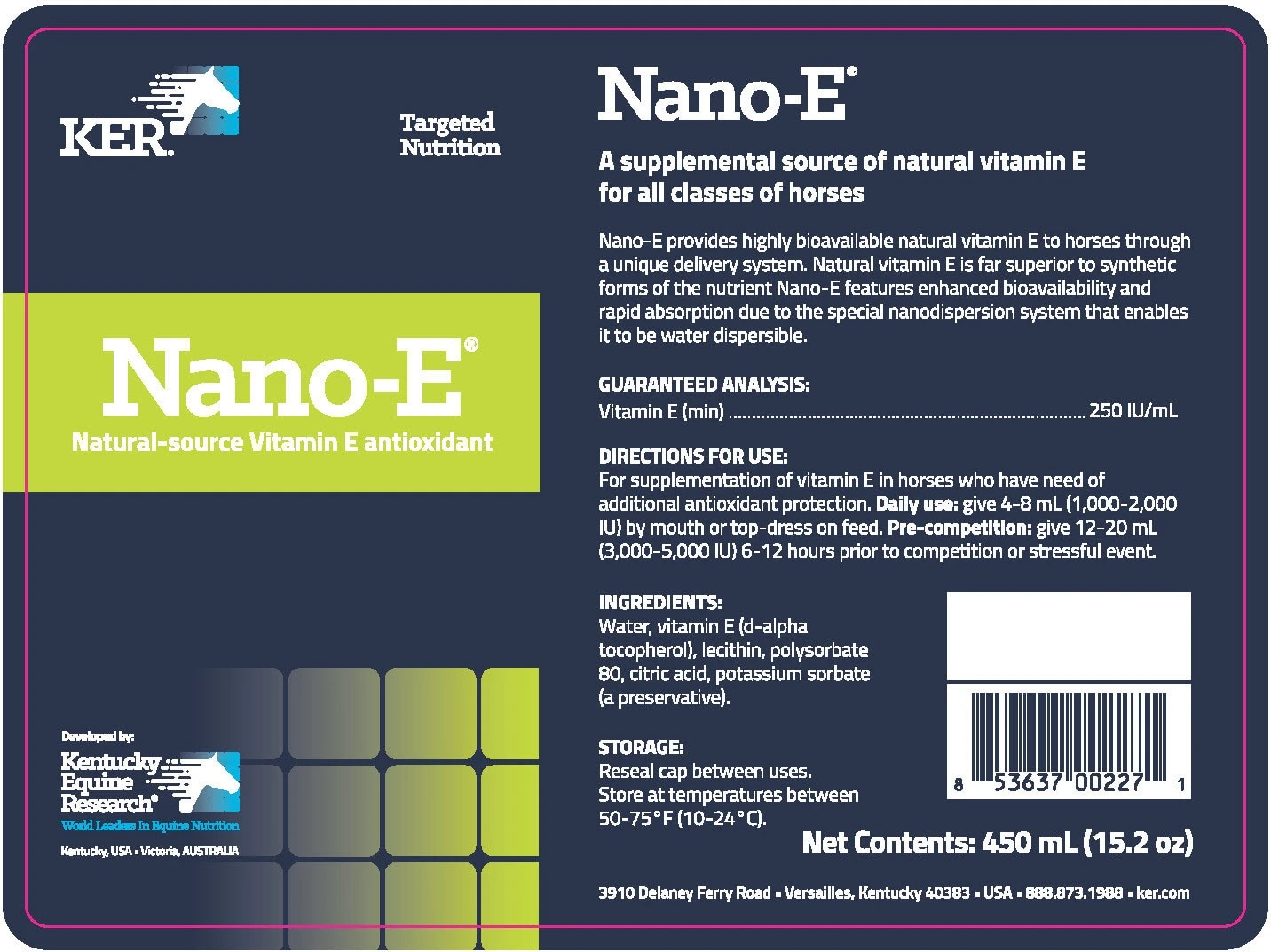 Nano-E® is a powerful water-soluble liquid vitamin E supplement for horses. Vitamin E is an essential component of your horse’s body-wide antioxidant defenses, and it plays a vital role in immune, cardiovascular, circulatory, neuromuscular, and reproductive functions. Nano-E was formulated using advanced nanotechnology that creates a rapidly available and absorbed source of vitamin E. Because it is rapidly available, administration can be timed to provide peak antioxidant protection to performance horses.