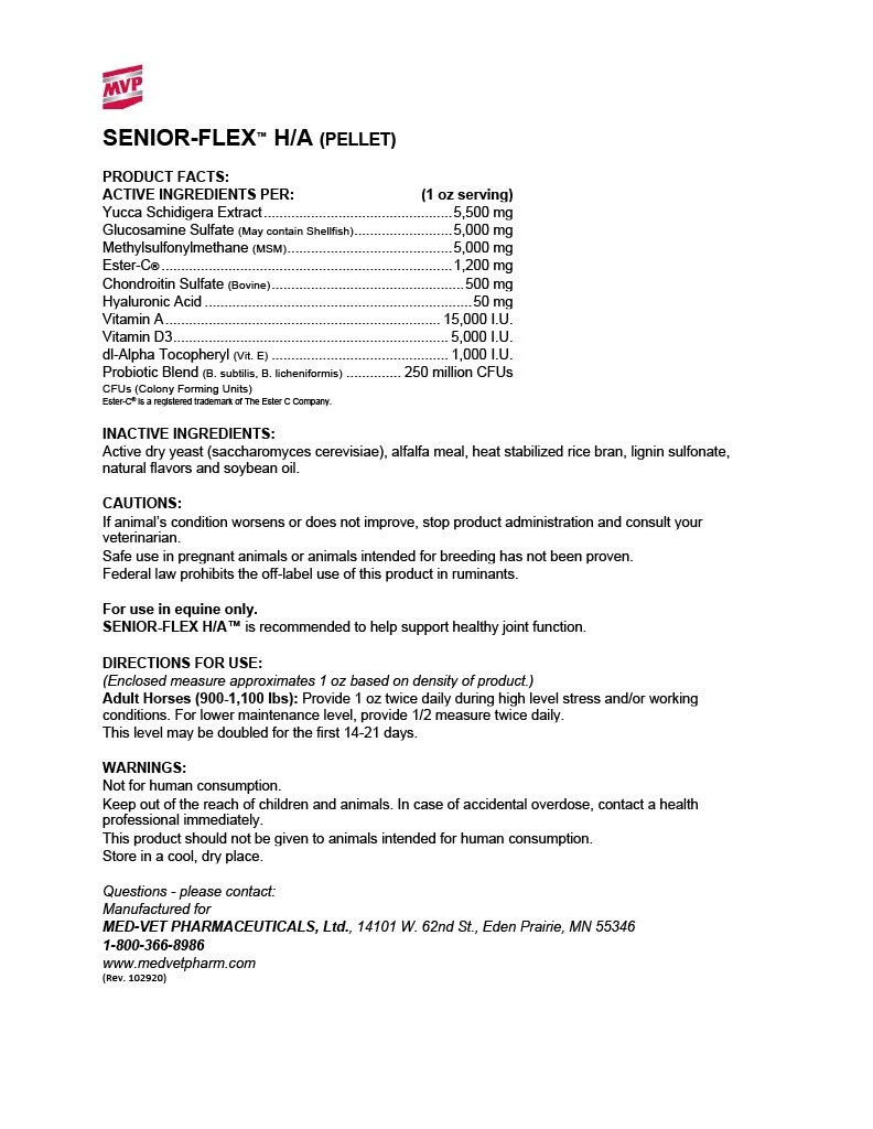 Senior Flex H/A is a unique combination of joint, digestive and antioxidant support for the senior horse. Provides 50 mg of hyaluronic acid, 5,000 mg of glucosamine, 500 mg of chondroitin sulfate, 5,000 mg of MSM, 5,500 mg of yucca, 1,200 mg of Ester-C, 15,000 IUs of vitamin A, 1,000 IUs of vitamin E, and probiotics to aid in maintaining body condition and digestive function. Your senior horse will love these tasty pellets!