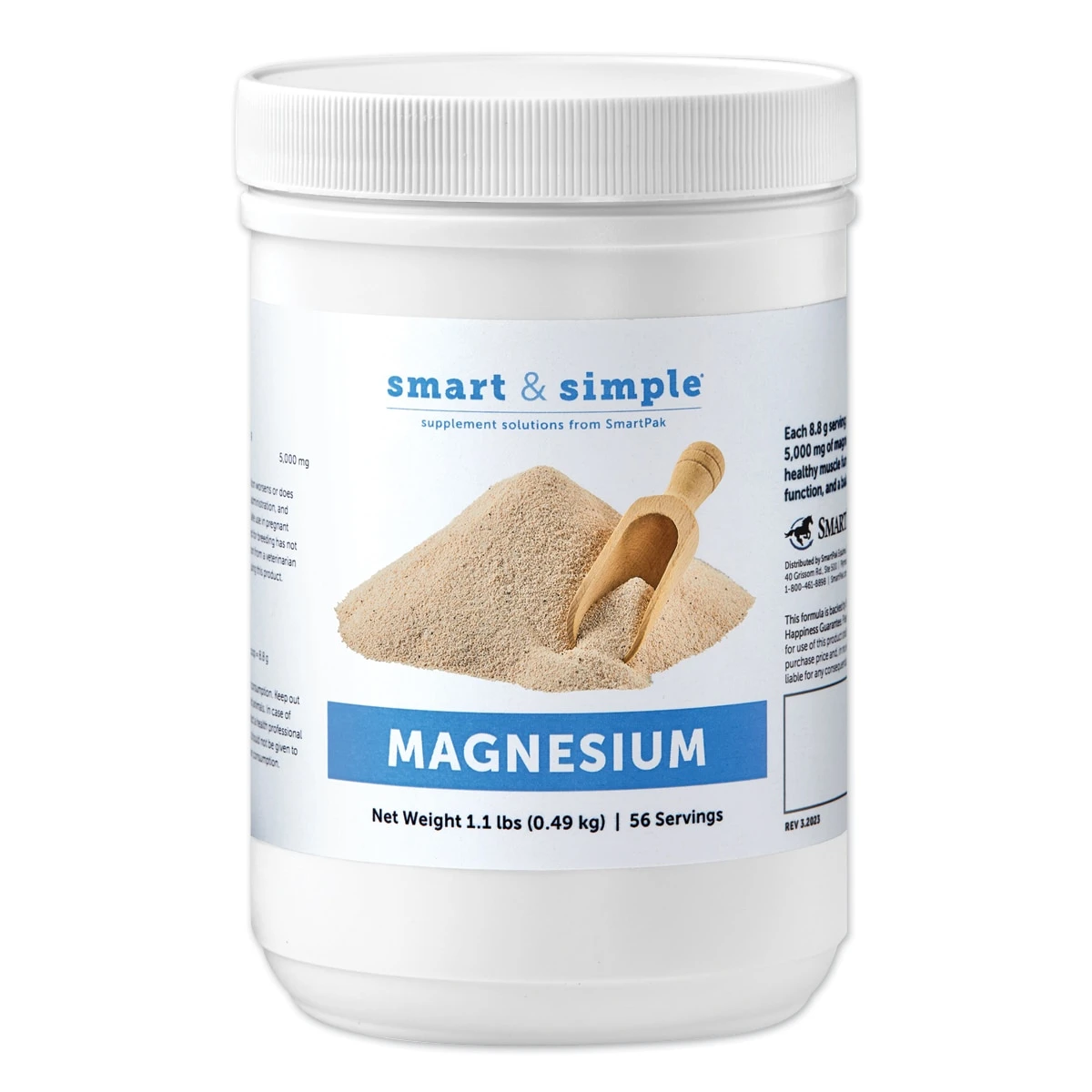 Smart & Simple Magnesium provides 5,000 mg of magnesium, a macromineral that plays key roles in muscle contraction, nerve signaling, and metabolic function. A common area of deficiency in horses, insufficient magnesium may lead to signs of nervousness, excitement, or muscle tremors. Supplementing magnesium supports healthy muscles, normal glucose metabolism and insulin sensitivity, as well as proper nervous system function to help promote relaxation and a calm demeanor.