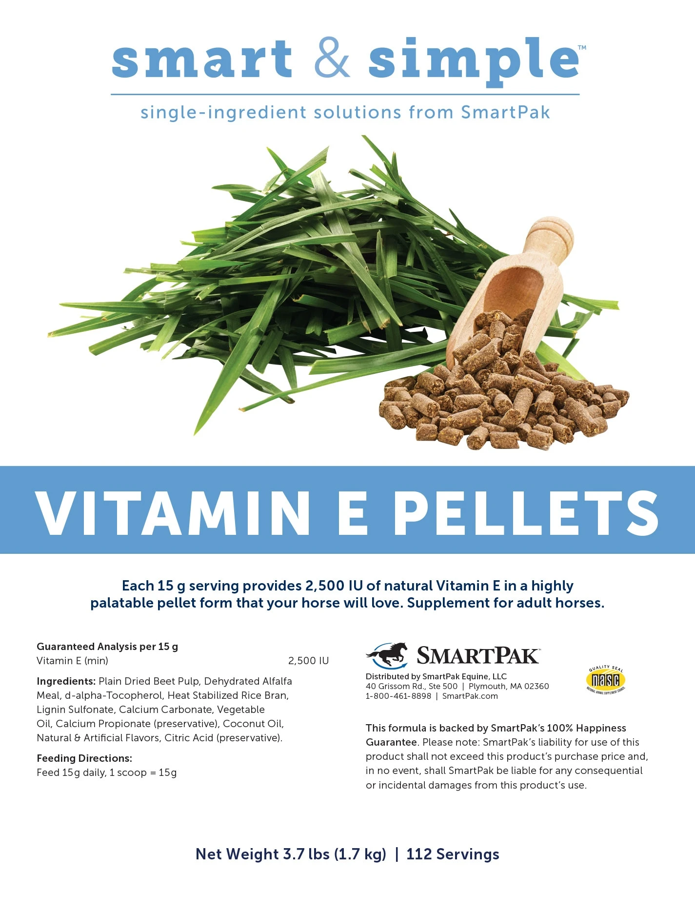 Vitamin E is a powerful antioxidant that supports a healthy immune system and helps neutralize free radicals, the damaging by-products of normal cellular activity. While this important nutrient is found naturally in fresh grass, levels begin to drop the moment grass is cut for hay. Horses without access to pasture, as well those in heavy work or under stress, should receive supplemental vitamin E. Research shows natural vitamin E may be the most effective form. Smart & Simple Vitamin E Pellets provide your horse with 2,500 IUs of natural vitamin E (d-Alpha Tocopherol) in a tasty pellet your horse is sure to love!