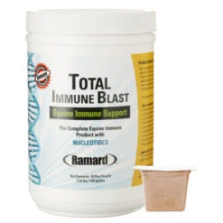 Total Immune Blast was designed to support healthy immune system function and help your horse’s body fight the damaging effects of the free radicals released by stress. One of this formula’s key ingredients, Neucleoforce™, is composed of nucleotides, which contribute to DNA synthesis as structural units and a therefore a key element in cell replication. The other key ingredients include glutamine, BioFlavex™, vitamin C, omega fatty acids, vitamin A, and selenium. This formula is ideal for supporting horses with stressed immune systems from training or environmental changes, or for horses stabled at show facilities or racetracks.
